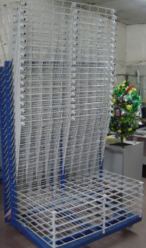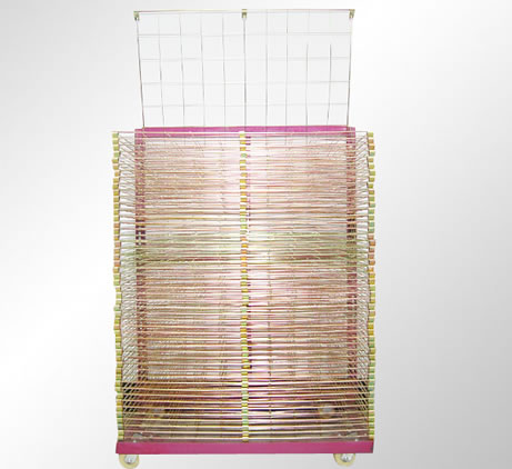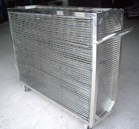 | 千层架,又叫丝印千层架、乾燥架、千层车、晾晒架、晾纸架、网架、层架台车。适用于印刷、上胶、喷漆、上色,溅镀後的晾乾置放器材。活动式多层网格设计,置放空间大,操作方便,节省车间、库房面积,并可适用於所放产品的常温晾乾和进焗炉高温烘烤。