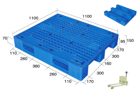 | 塑料托盘(pallet)是为了便于货物装卸、运输、保管和配送等而使用的由可以承载若干数量物品的负荷面和叉车插口构成的装卸用垫板。它是物流产业中最不起眼,却又无处不在的一种物流器具,是静态货物转变为动态货物的主要手段。尽管只有一米见方大小,却“可以移动整个地球”,所以又叫做“活动的地面”、“移动的货台”。